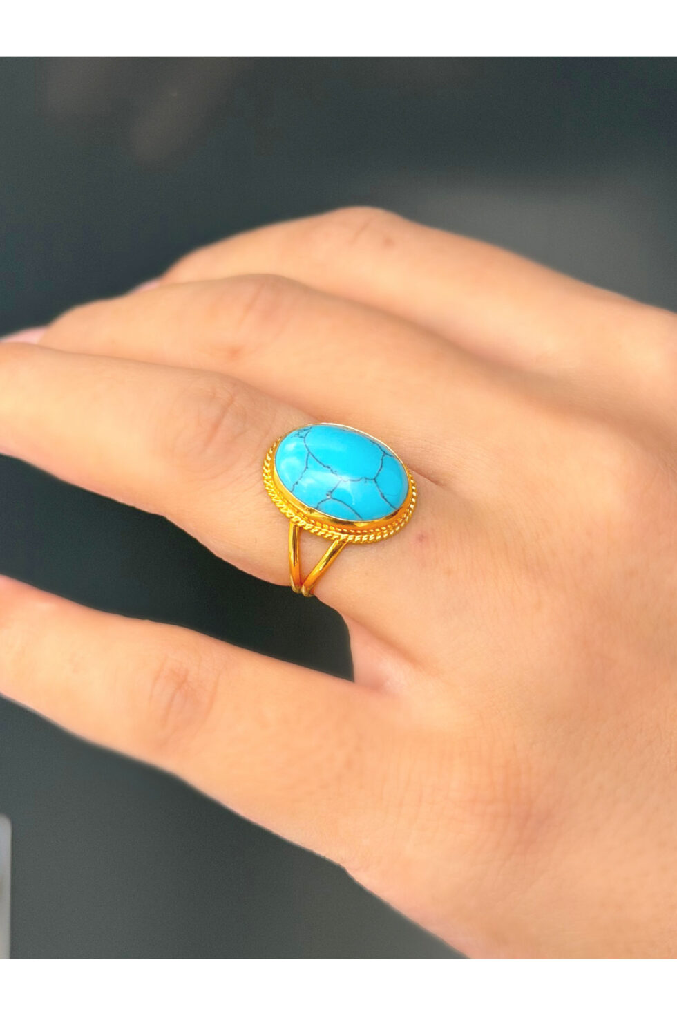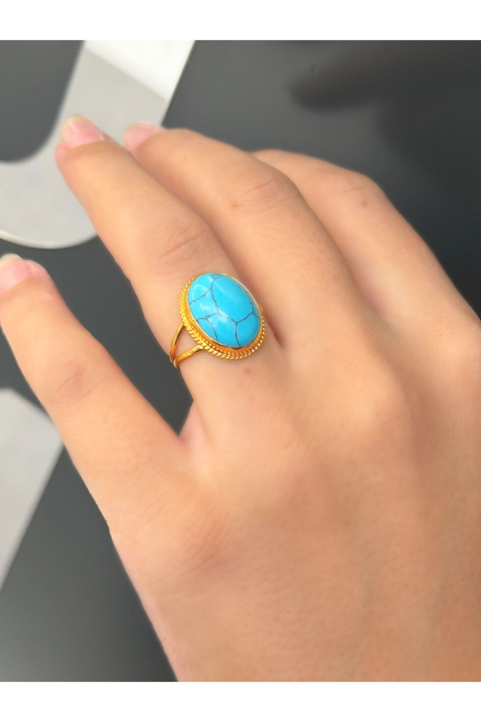 - Üzerindeki damarlı firuze taşı, doğal güzelliği ve göz alıcı mavisiyle dikkat çeker.