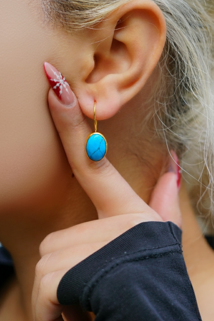 14 Ayar Altın Oval Damarlı Firuze Küpe