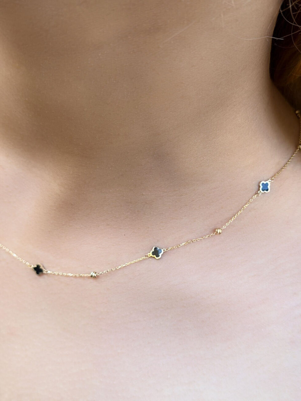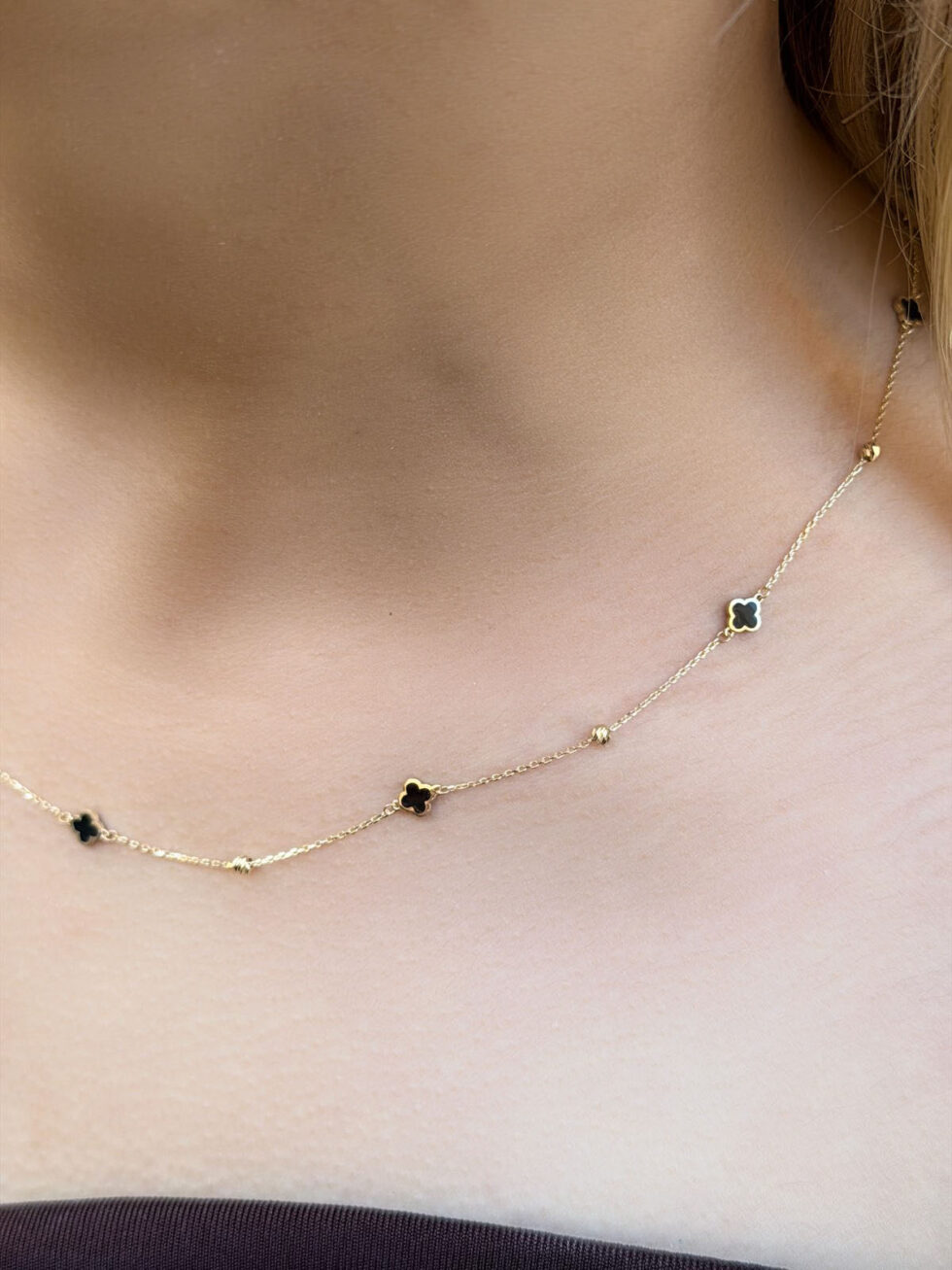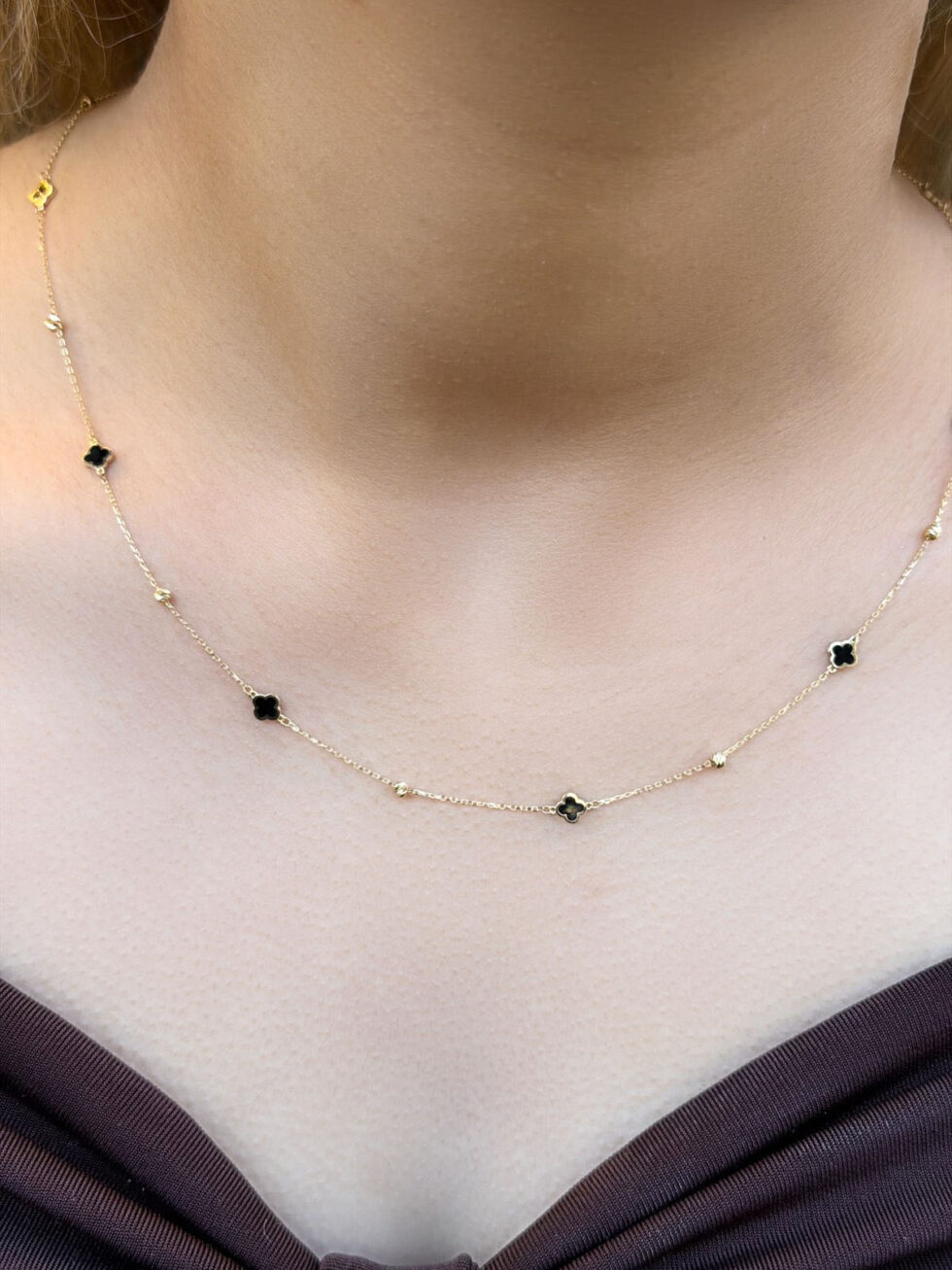 14 Ayar Altın Siyah Mineli Yonca Kolye