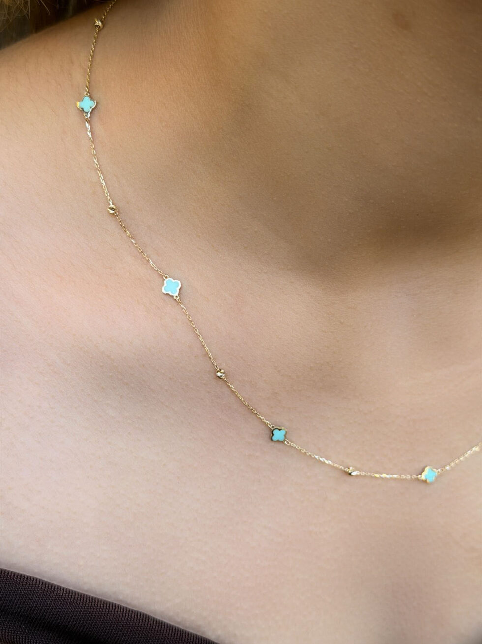 14 Ayar Altın Turkuaz Mineli Yonca Kolye