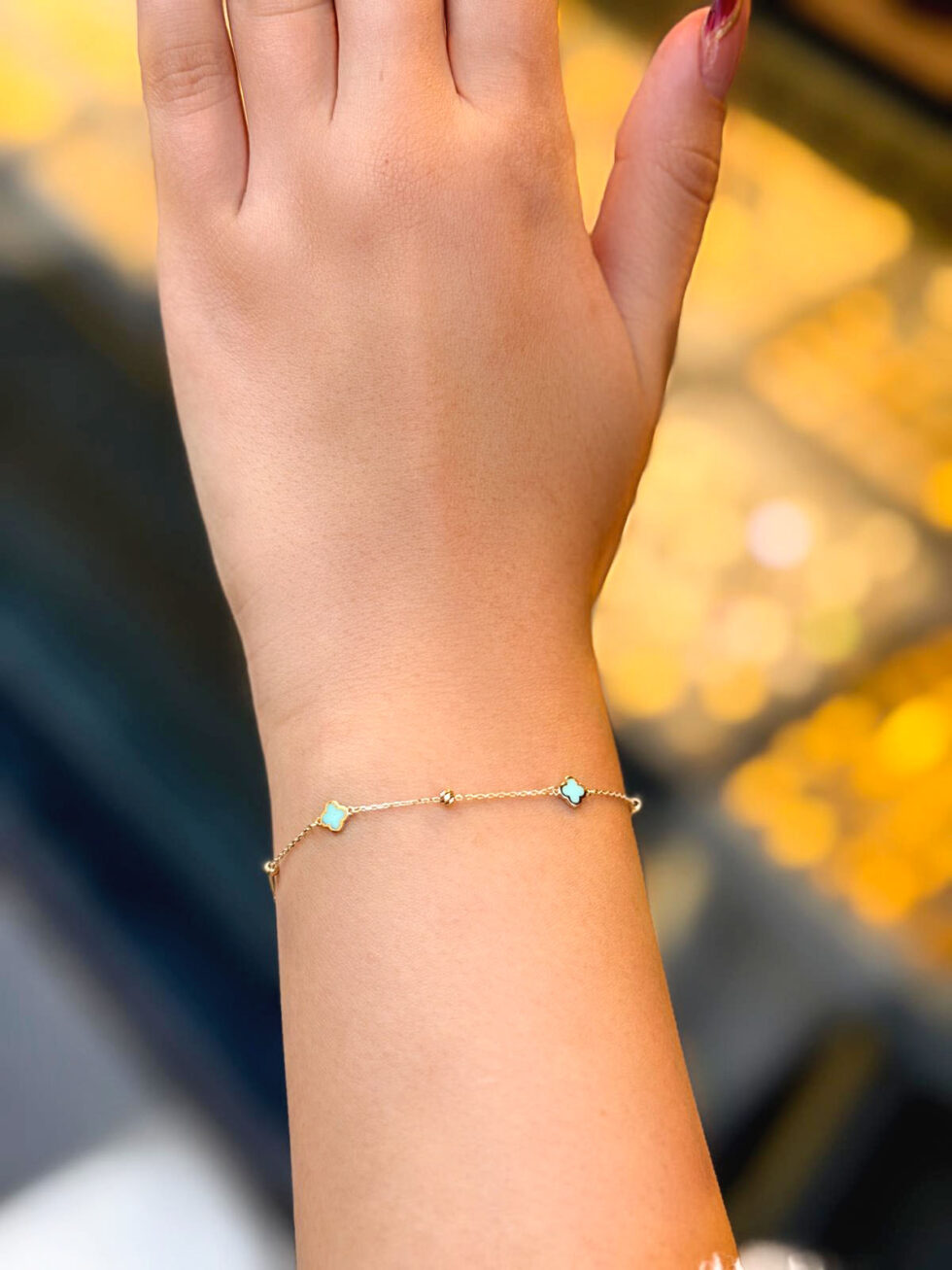 Bu ürün: 14 Ayar Altın Turkuaz Mineli Yonca Bileklik